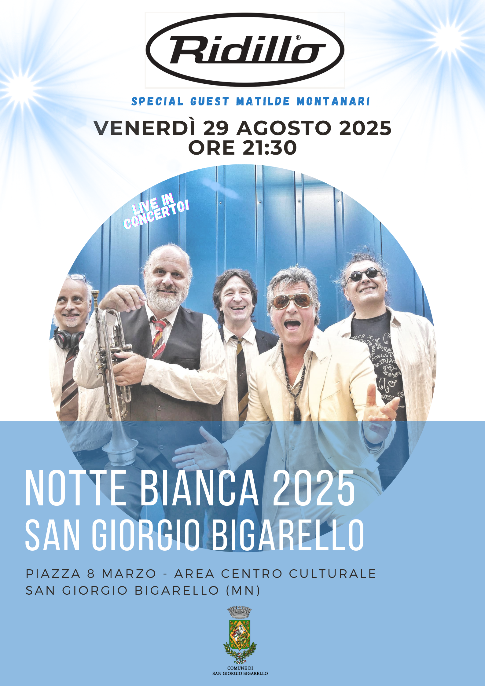 La storica band dei Ridillo si esibirà nella prima delle due serate di eventi dell'edizione 2025 della Notte bianca di San Giorgio. Il gruppo italiano, che festeggia oltre trent'anni di carriera e rappresenta un punto di riferimento del funk e soul italiano, ha scelto il palcoscenico a cielo aperto di San Giorgio Bigarello per un concerto gratuito.