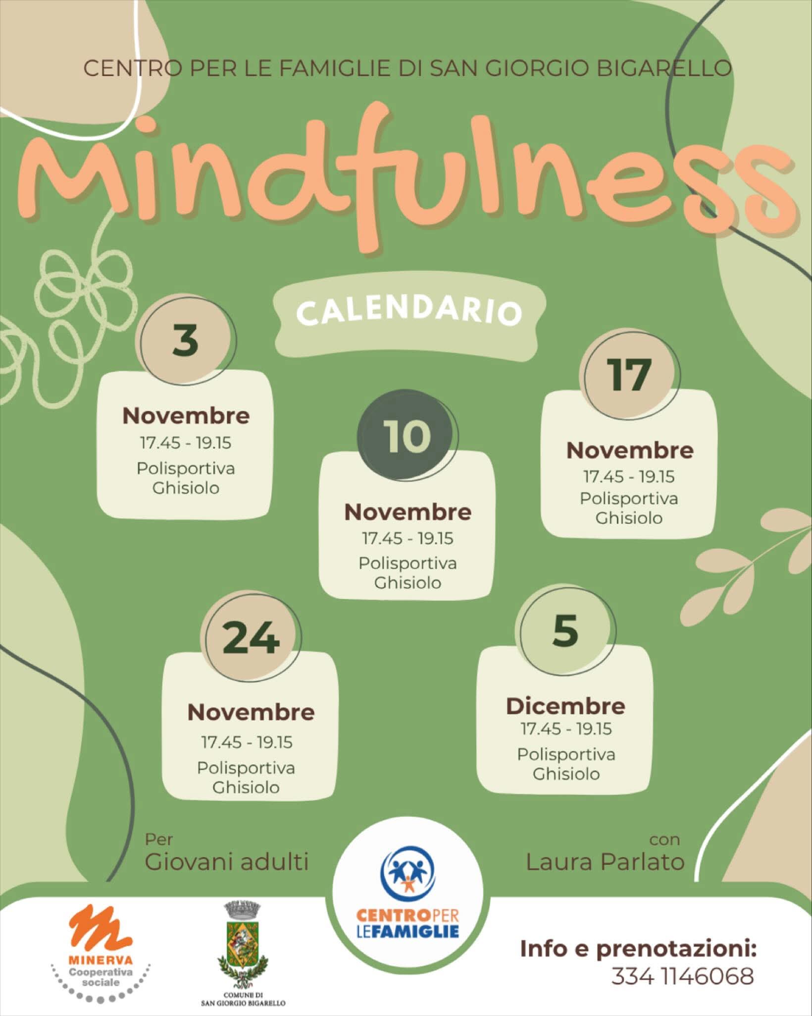 - presso la polisportiva Ghisiolo, in Via Lanzoni, 5 - loc. Ghisiolo, si svolgerà dalle ore 17.45 alle ore 19.15 il progetto Mindfulness, rivolto a giovani e adulti, che si occuperà di pratiche di consapevolezza per gestire lo stress, come migliorare la concentrazione e promuovere resilienza e benessere psicologico. Gli incontri si svolgeranno nelle seguenti date: