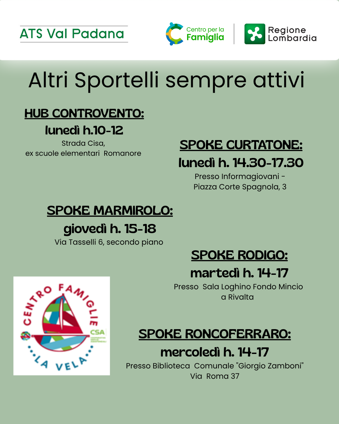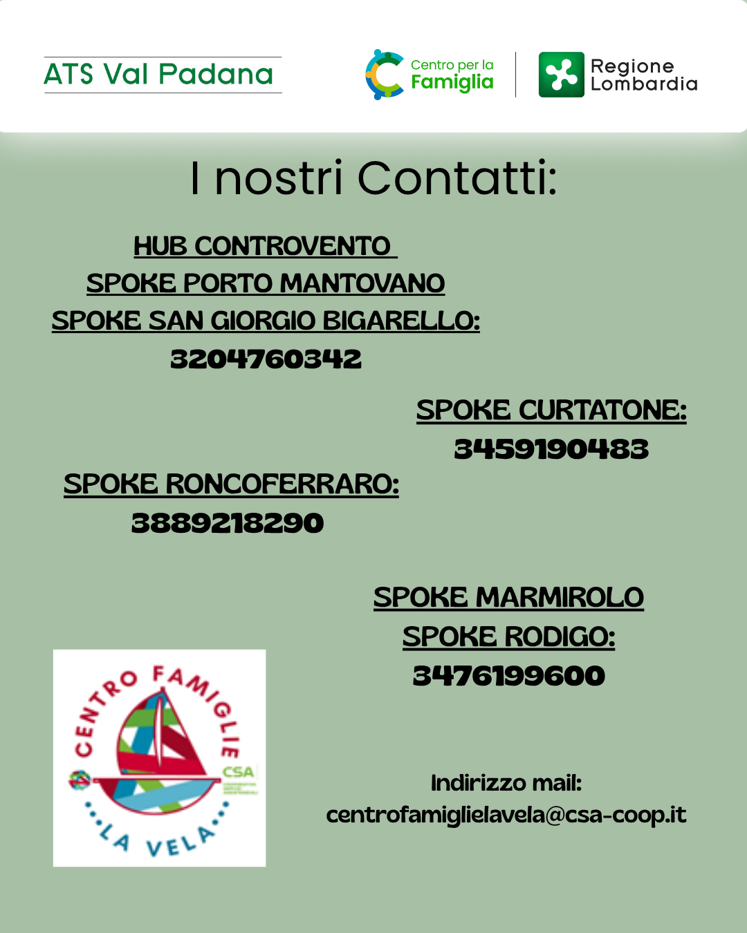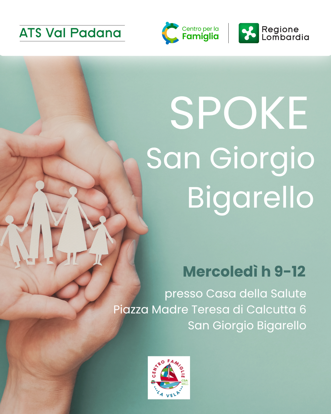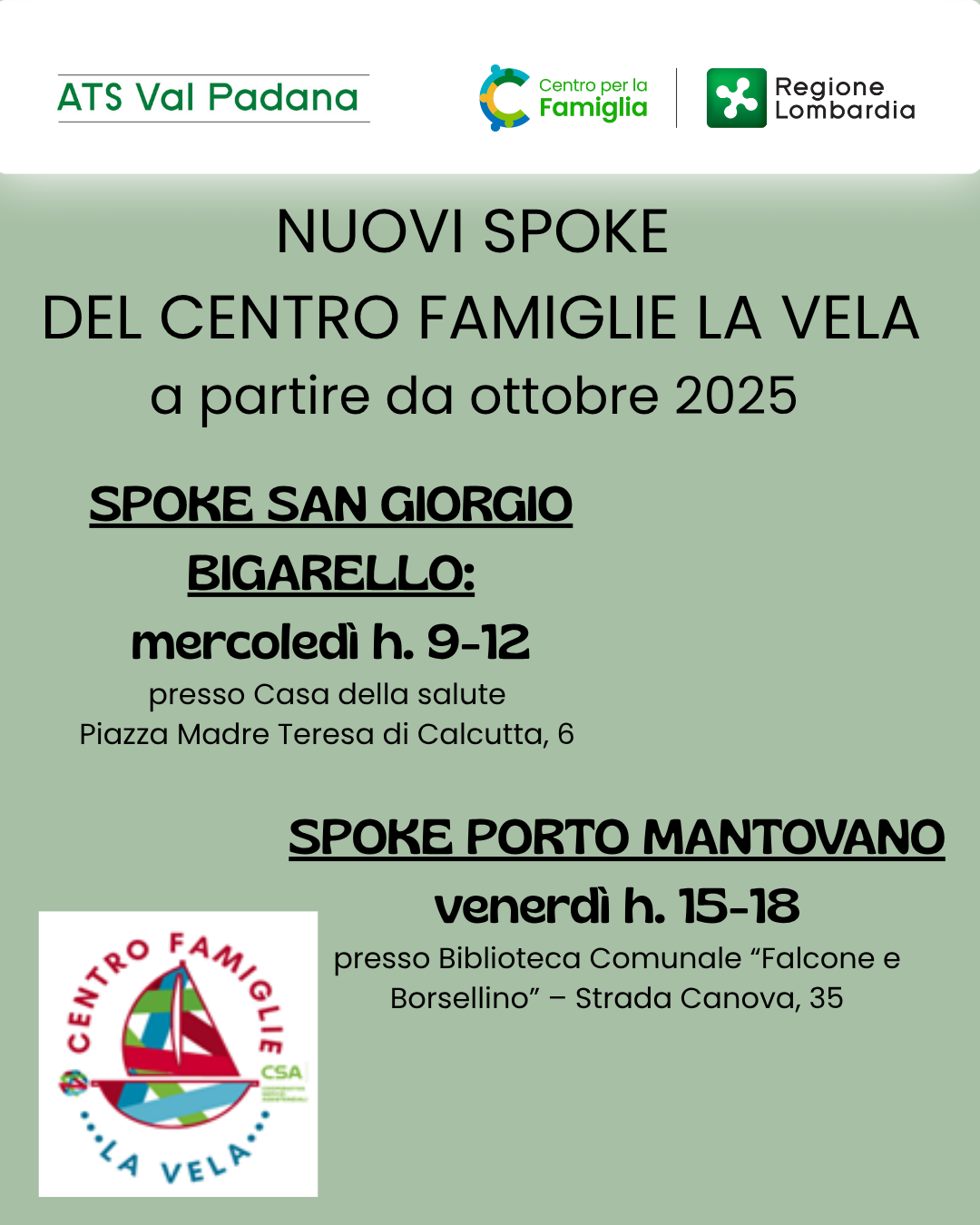 Il Centro Famiglie La Vela dell’ambito di Mantova, che ha come capofila cooperativa CSA, offre un punto d’accesso nel Comune di San Giorgio Bigarello presso la Casa della Salute il mercoledì dalle 9:00 alle 12:00. Sarà possibile confrontarsi con operatori specializzati che sapranno accogliere i bisogni dei cittadini, orientarli verso i servizi territoriali, valorizzando le risorse presenti nel contesto locale.