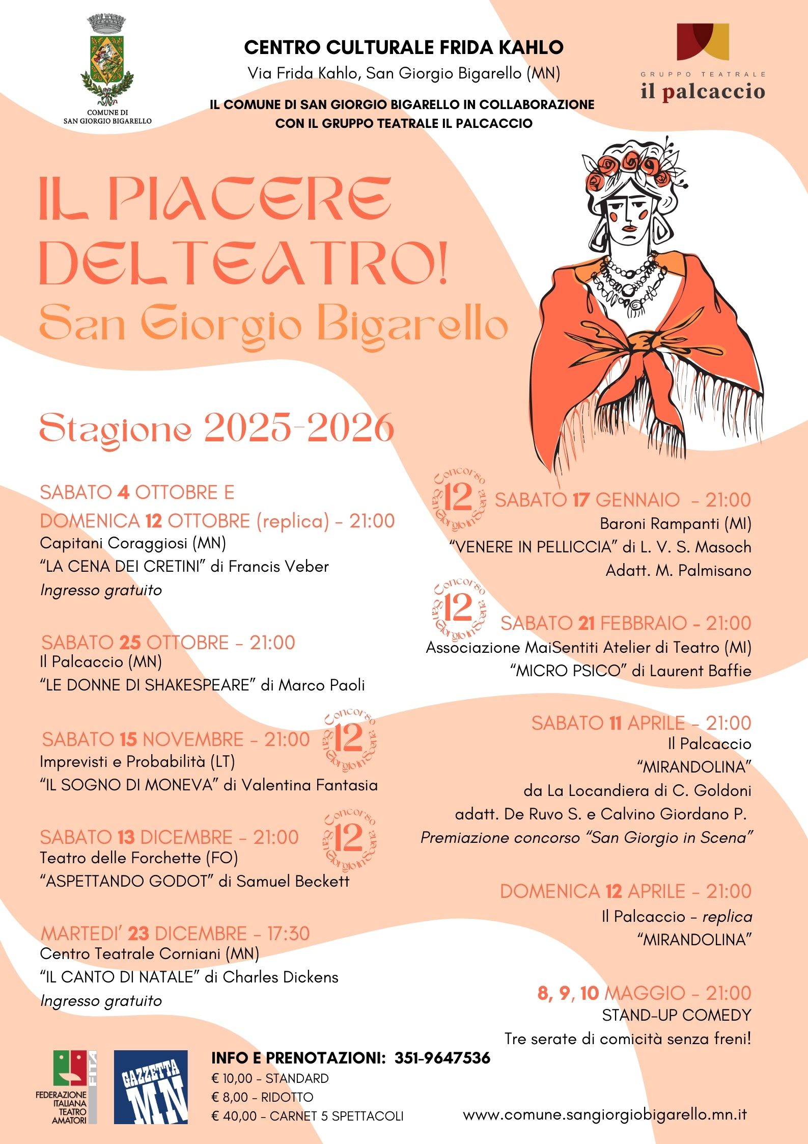 La stagione teatrale organizzata dal gruppo teatrale Il Palcaccio, in collaborazione con il Comune di San Giorgio Bigarello, prende il via: un cartellone di dieci appuntamenti a partire da ottobre 2025 fino a maggio 2026 che porta sul palco dell'Auditorium del Centro Culturale di via Frida Kahlo grandi storie, grandi classici e una proposta culturale per tutti i gusti e tutte le età.